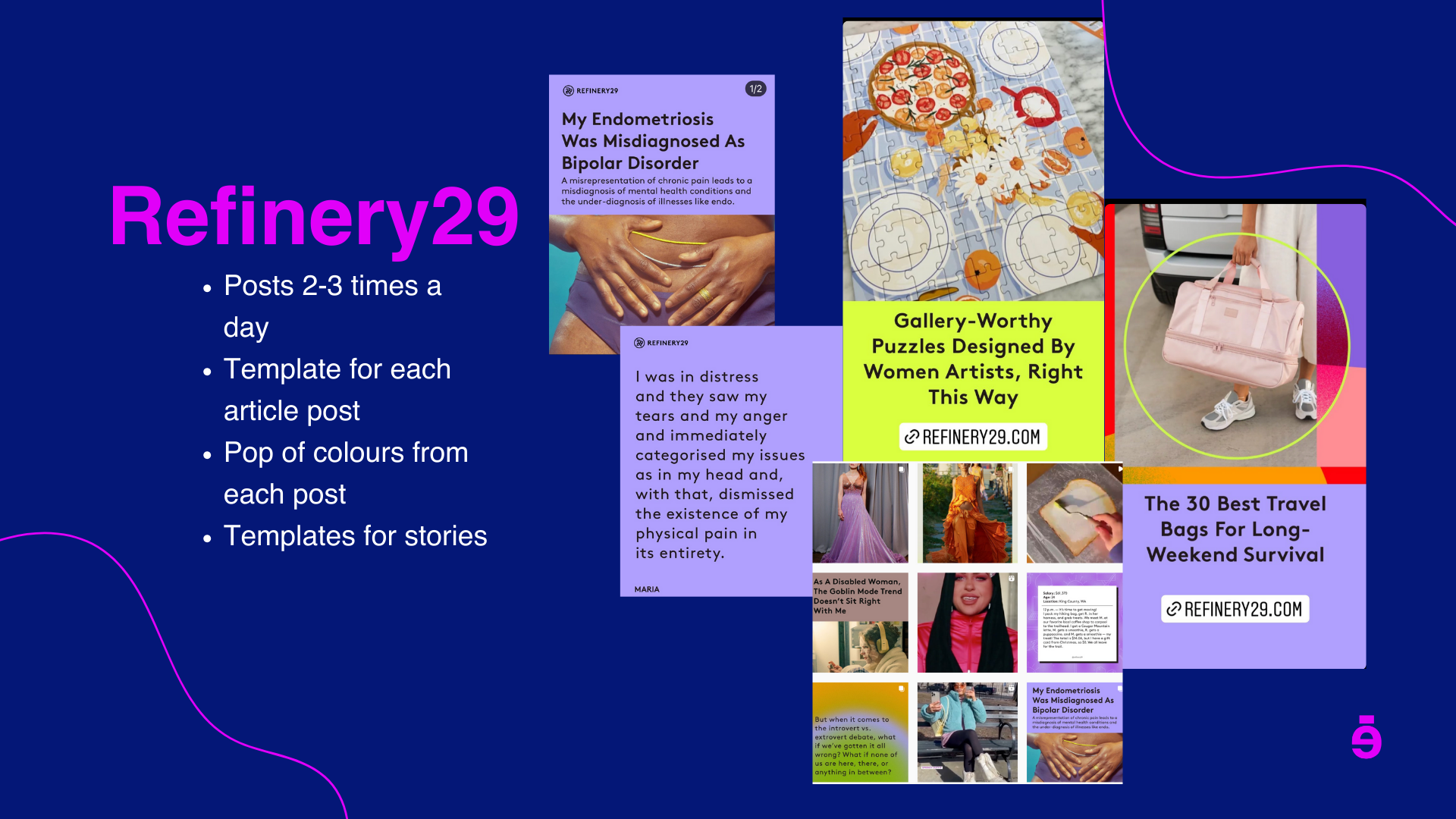 For the post templates, as mentioned previously, I created a variety for the team to choose what they liked the best. After some consideration and alterations, the final article template for the Instagram grid is seen below. (Checkered grid template)