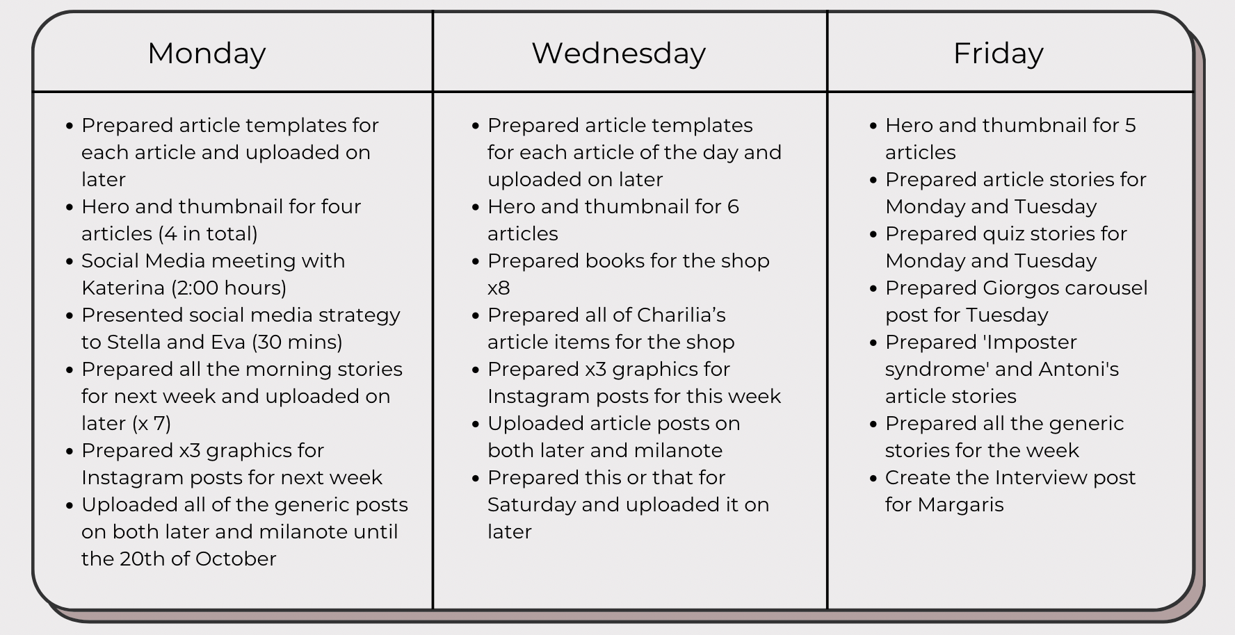 This is why a traditional Gantt chart or timeline would not be a sufficient way to present my time management skills as those are more suitable for long-term projects. Instead, I have been keeping a timesheet along with the rest of the team to keep track of what we work on each day. Since this is a shared document with other employees, I am not able to share the full timesheet but I have chosen to share a week that I feel best represents the quantity of work I typically produce as a way to show what a typical day at Estella looks like for me.