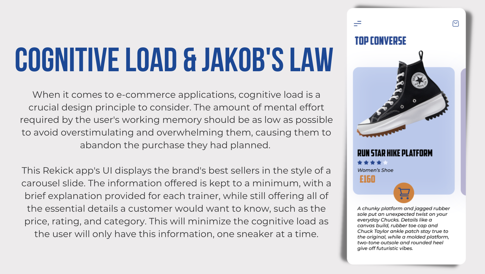 The design will employ Hick's law, which argues that the more options a person has, the longer it takes them to make a decision. As a result, rather than having a large menu list of all the products Rekicks offers, the menu will be divided into categories based on the brands of sneakers. When the user finds the brand they're looking for, they can click on it to get a more detailed list of products.