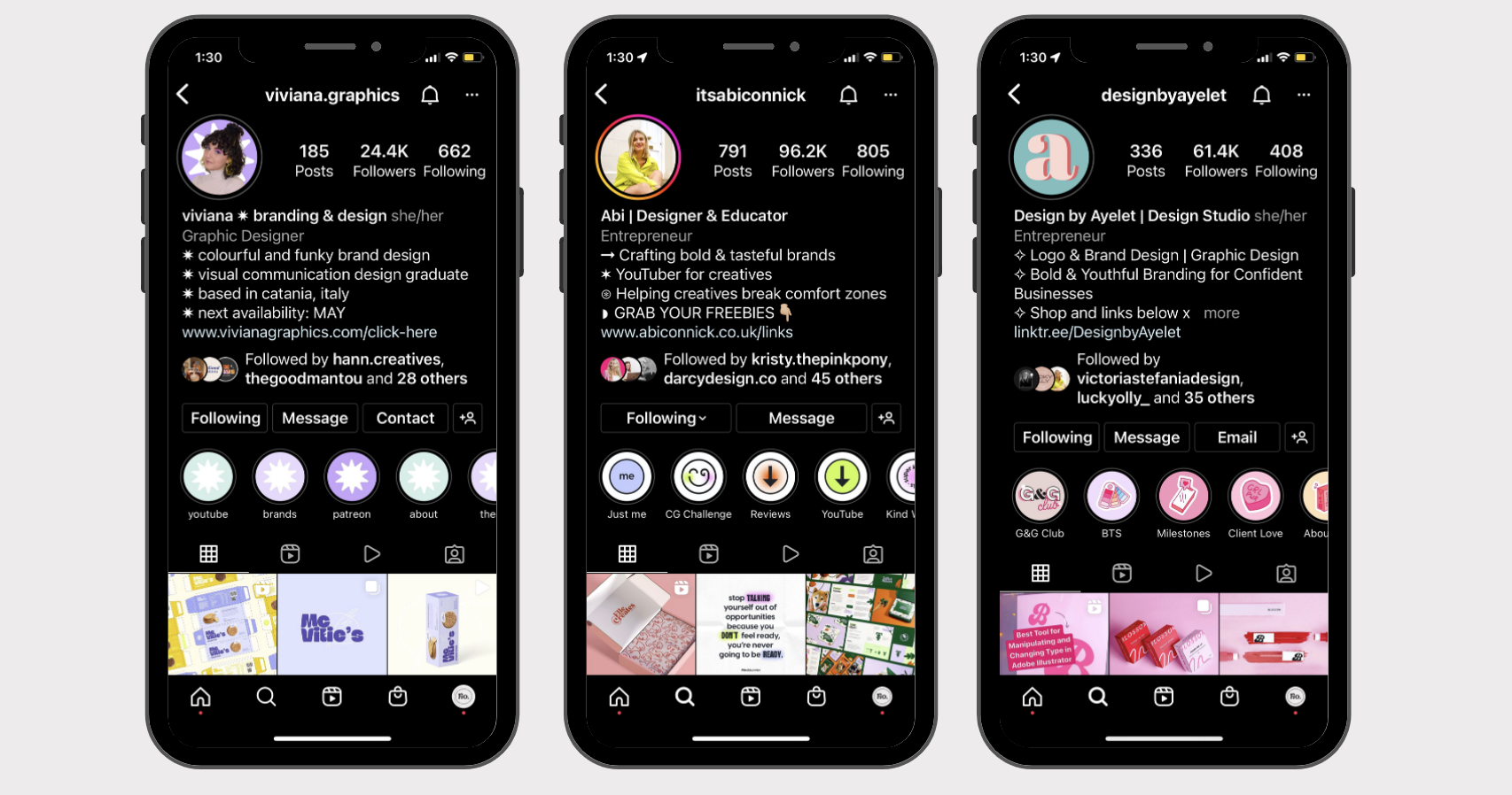 When looking for inspiration for my Instagram account, I knew that I wanted to look at other freelance brand designers and see how they set up their feeds. Below are the three designers that I have been following for a while now and have inspired me to try freelance design. I love their design aesthetic and their content, which is why I believe they will act as great inspirations for my own account.