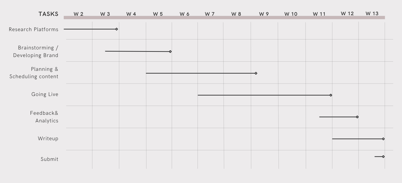 I broke down my timeline into the 5 sections of the design process and made sure to leave two weeks in the end for me to write up the project and add it to my website for submission. The first two weeks were dedicated to researching the social media platforms, such as the best days and times to post, what content to post, looking at other accounts and getting inspiration for my own.