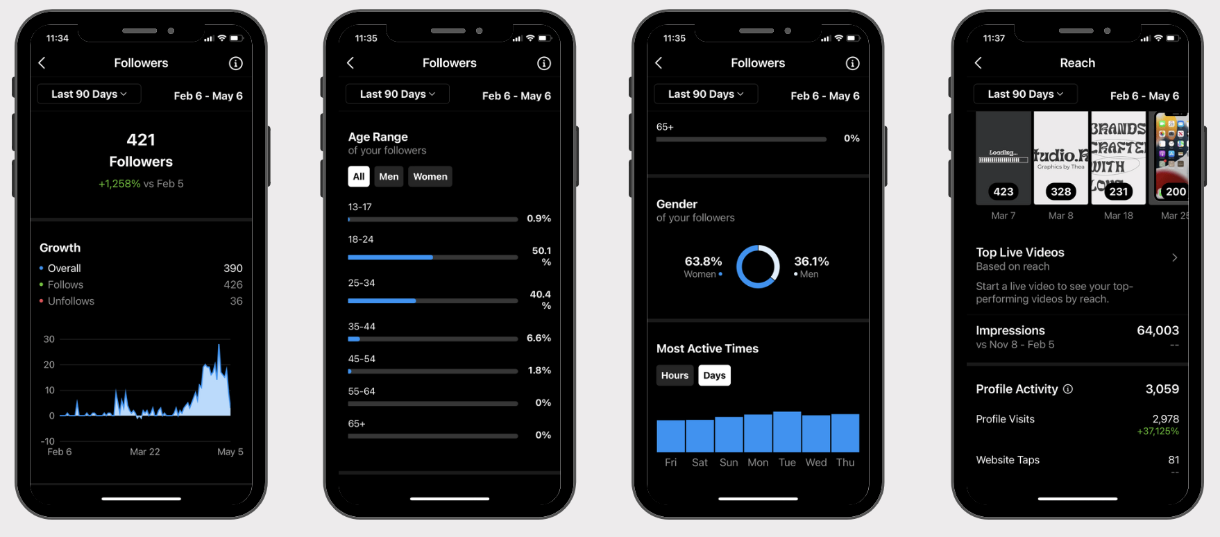 This is the breakdown of my follower analytics. These helped me see if my content was reaching my target audience of females, between the ages of 18-35. As seen above the ages 18-24 are the highest with a very close second the ages 25-35, proving that I am reaching the age demographics for my target audience. The gender analytics also show that I reached my target audience with 63.8% of my followers being female.